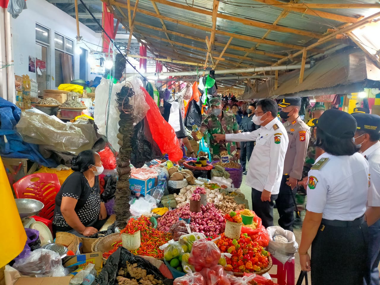 SEMANGATKARYA.COM, Toraja Utara – Kapolres Toraja Utara AKBP Eko Suroso bersama Dandim 1414 / Tator Letkol Amril Haeruman Tehupelasury dan Wakil Bupati Toraja Utara Frederik V. Palimbong serta Kepala Dinas Perindustrian dan Perdagangan (Disperindag) Kabupaten Toraja Utara Daniel T Rantetasak melakukan inspeksi mendadak (sidak) ketersediaan bahan pangan menjelang bulan Ramadhan di Pasar tradisional yakni Pasar Pagi Rantepao dan pasar Bolu kecamatan Tallunglipu , Rabu (29/3/2022).